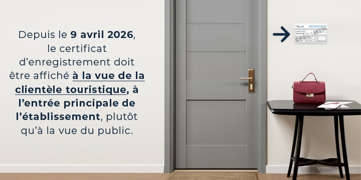 Assurez-vous que votre certificat d'enregistrement est bien affiché à l'entrée principale de votre établissement, de manière visible pour votre clientèle ; |